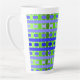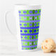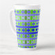 Cette tasse a un design géométrique de lignes dans les tons bleu et vert tissé pour faire un plaid.