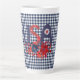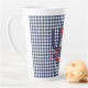 La tasse en latte colorée Americana présente les Etats-Unis dans des lettres d'art folklorique décorées en rouge et bleu avec bouquet floral rouge et bleu sur marine en vichy à damiers arrière - plan. Parfait pour 4 juillet décor