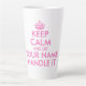 Faites votre propre drôle, gardez le calme et laissez-le s'occuper de la tasse latte. Tasse café sur mesure avec vintage gardez le calme et continuez à porter le modèle de typographie y compris une couronne rose. Vêtements amusants à domicile ou au bureau. Créer des cadeaux d'anniversaire humoristiques pour maman, papa, père, grand-père, mari, femme, épouse, wedding planner, collègue, collègue, professeur, coach, amis, manager, employés, famille, patron d'entreprise, fan de Trump, etc. Verre en forme de cône imprimé de chaque côté. Disponible en 12 oz et très grand format 17 oz. Grosses tasses à boire avec grand espace d'impression. Des idées-cadeaux d'humour de bureau.