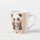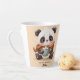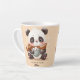 An utterly adorable illustration of a fluffy panda getting cozy for the winter. Dressed in a warm blue jacket and a stylish pink scarf, this sweet bear is holding a large mug of steaming hot chocolate topped with marshmallows. With gentle snowflakes falling in the background, this image is the epitome of winter comfort and cuteness.