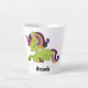 Une tasse en latte avec l'image d'une licorne de style Frankenstein. Couleurs violettes et vertes. Éffrayant mignon.