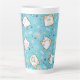 Tasse en latte avec un mignon motif de chat, posée sur un arrière - plan bleu et décorée avec des arcs-en-ciel et des empreintes de pattes et plus encore.