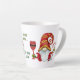 Sur les deux côtés de cette tasse de latte de vacances est un elfe de gnome mignon vêtu d'un chapeau de Père Noël motif de rennes rouge et or. Il tient un verre de vin du Père Noël d'une main, et un sucre de canne rayé rouge et blanc de l'autre. Le texte vert entre les images dit "CAFÉ MAINTENANT...MAIS VIN PLUS TARD".