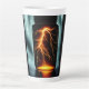 La tasse en latte de l'art numérique cool présente une foudre spectaculaire à l'intérieur d'un bocal fermé. La foudre proverbiale dans une bouteille...