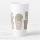 Tasse en latte au design fantaisiste. 3 cactus mignons tous dans une rangée avec des visages souriants assis dans un pot à fleurs chacun portant des bijoux.