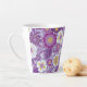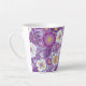 Cette tasse en latte présente des fleurs et des feuilles dans les tons violet, magenta, jaune et blanc sur un arrière - plan violet.