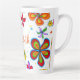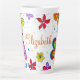 Design floral rétro aux couleurs vives sur un café haut, ou tlatte. Grande, la tasse blanche a de grandes fleurs autour d'un modèle de nom central en écriture orange. Cette tasse est disponible en deux tailles et le design fonctionne bien sur l'une ou l'autre.