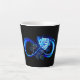 Luminous infinity symbol with glowing, beautiful, lushly blooming rose made of blue flames on black background.