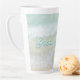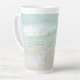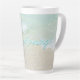 Tasse latte de scène de plage avec texte "bonjour", ou le modifier / le supprimer. Cette grande tasse a une image de plage tropicale avec eau tropicale claire, surf blanc et sable de plage. Le lettrage est écrit en mousse de mer couleur verte avec effet d'ombre.