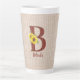 Jolie tasse en latte personnalisée avec décoré rustique lettre en bois de grange rouge / initiale B a avec ornement bouquet de tournesol sur un arrière - plan burlap beige.