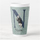 Le design fantasque pour les amoureux de tout âge d'Alice au pays des merveilles comprend la lettre majuscule / N initiale avec remplissage en arlequin noir et bleu et l'illustration originale en lapin blanc qui a été teinte, sur un arrière - plan vintage en détresse et l'écriture bleue teintée bleue. Personnaliser avec le nom ou un autre message