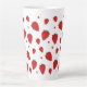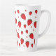 Une tasse en latte avec un motif à fraise avec le fruit de différentes tailles en rouge et blanc.
