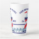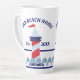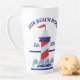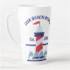 Commémorez votre été ou votre maison de plage avec cette tasse de latte de 17 oz. Ce design fantaisiste et nautique présente une lumière rouge, blanche et bleue. Au bas du design, il y a une rangée de poissons. Le texte en haut, "NOTRE MAISON DE PLAGE" peut être personnalisé avec le texte en bas, “Établie en 20XX”. Ce design apparaît à l'avant et à l'arrière de la tasse et est également disponible en 12 oz.