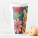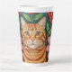 Coffee mug with a cute orange cat with folk art red and pink flowers.