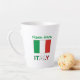 Tasse en latte personnalisée avec le drapeau italien vert, blanc et rouge ou Il Tricolore. Ci-dessous le mot ITALIE, également dans le tricolore italien. Ci-dessus est un endroit pour votre nom, en lettres vertes, pour ajouter un look customisé. Ou, créez un cadeau personnalisé en ajoutant le nom de quelqu'un d'autre. Idéal pour les réunions de famille, les groupes de voyage et les clubs.
