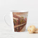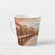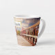 Une tasse en latte avec une photo pittoresque. Un pont en bois qui mène à un chemin entouré d'arbres forestiers qui changent de couleur.