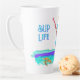 SUP life latte mug with original artwork. A blond girl paddles on a purple board in tropical water. Her brown dog is riding along and a sea turtle swims alongside. "SUP life" text on one side, and her name on the other in aqua blue with purple drop shadow. Makes a fun gift for a teenage daughter.