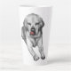 Des nuances de gris riches encadrent un visage sérieux brisé par une langue rouge soudaine, des parties égales loyales et espiègles. Un début ludique pour les matinées aux épices citrouilles.