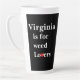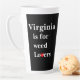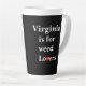 Virginia Is for Weed Lovers Personalized Latte Mug présente une pièce sur la devise de l'état de Virginie, mais au lieu de dire "Virginia is for Lovers" avec le coeur rouge prenant la place du "v" dans "Lovers", il dit, "Virginia is for Weed Lovers" avec le coeur rouge remplaçant le "v" dans "Lovers" en soutien à la décision de Virginia de légaliser weed in 2 021. Vous pouvez personnaliser cette drôle de conception de mauvaises herbes de Virginie en ajoutant du texte et des images de votre propre pour le rendre unique à vous.