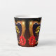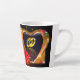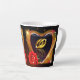 Belle tasse en latte avec une image imprimée d'une peinture acrylique de deux anneaux mariages en or à l'intérieur d'un coeur en forme d'or avec une rose rouge.
