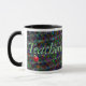 Un concept original et une oeuvre de ZoeSPEAK remplissent cette Mug en reconnaissance des enseignants - un logo original et un slogan pour les enseignants qui dit "Les enseignants servent de la nourriture pour la pensée". Les mots "Teachers serve" sont en italique vert pomme, ce qui conduit à l'illustration d'une assiette blanche avec les mots "FOOD FOR THOUGHT" en lettres majuscules rouges, courbées pour remplir le centre du plat. En haut de l'assiette se trouve une pomme rouge brillante avec une feuille verte, et une autre pomme dans le coin inférieur gauche de la tasse. L'arrière - plan de la tasse est un motif coloré, principalement gris foncé, mais parsemé de taches de rouge, de bleu et de vert. Les lettres de l'alphabet, en casquette et en coque inférieur, plus les nombres de zéro à neuf courent en diagonale en blanc pur à travers l'arrière - plan.