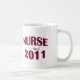 D'un côté de cette tasse en texte incurvé rougeâtre-pourpre audacieux il lit : "INFIRMIÈRE 2011". Au milieu de ce texte en plus petit, personnalisable texte sont les mots "classe de". Donnez à cette tasse un contact plus personnel en ajoutant votre nom ou votre nom d'école au bord opposé ! Cette conception peut être employée sur n'importe lequel d'un certain nombre de de différents tasses, verres et steins. Pour tous ceux qui travailleront ainsi être dur 2011 diplômés d'école d'infirmières.