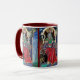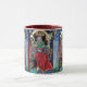 Coloré, vibrant, peinture contemporaine en or, bleu, rouge, vert, couleurs marron. Un mystérieux sorcier hypnotique avec d'élégants costumes de velours rouge tenant une sphère magique assise sur un trône gothique avec des gargouilles et une chouette. Ambient est surréaliste, fantastique, alchimique où vous voyez un bouchon boire d'une tasse, un moine tempéré volant sur une grenouille, bulles transparentes, paysages d'imaginaire avec feu d'enfer, ciel bleu cosmique avec étoiles, montagnes du ciel, arbres.Egg Tempera sur panneau en bois avec feuille d'or. 1989, Miniature Fabriquée avec des techniques picturales de 1300 par Alessandro Lumini (c) C'est aussi un beau design d'imaginaire pour Noël, Fête, Anniversaire, Jour de la Saint-Sylvestre, Mardi Gras et salutations carnavales.
