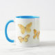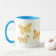 Une tasse blanche avec une jante et une poignée bleues et un délicat dessin peint de papillons orange.