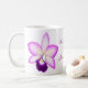 Conception originale d'art d'une orchidée de Cattleya dans le pourpre par le concepteur Carolyn McFann sur une tasse de café de qualité pour des amants de fleur. Une grande idée de cadeau de mariage.