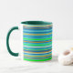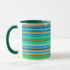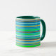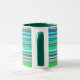 Cette tasse gaie est décorée d'un motif animé de vert, d'or, d'orange, de bleu, de turquoise et de rayures horizontales blanches et est équilibrée avec le vert.