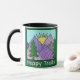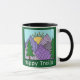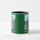 Tasse rustique avec montagnes violettes et contours de forêt et les mots "Happy Trails".