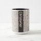 La photo sensible de la texture de roche couvre la partie de cette tasse. Opposé de la poignée, il y a une bannière nommée verticale semi-transparente. La bannière est noire, et le texte est gris-clair à brun clair.
