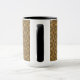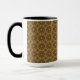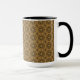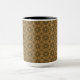 Cette tasse présente un motif de carrelage abstrait et répétitif dans les tons or et marron.