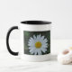 Eine grosse, weisse Margeritenblüte auf einem dünnen beigen Stäbchen, vor dunklem Hintergrund ist das Design dieser Tasse.