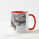 Cette image originale de Noël est un tableau d’un très mignon petit chien de race mixte noir et bronzé, il reniflait et gratte l’épaisse couche de neige fraîchement tombée qu’il vient de découvrir pour la première fois dans le jardin. Ce petit chien s’appelle Eddie, c’est un berger allemand de race croisée et il profite du froid dans son jardin d’hiver. Dans l'arrière - plan de cette image festive, vous pouvez voir un petit gnome de jardin gris tranquillement assis et lisant son livre sur le côté du petit étang gelé couvert de neige. Il y a aussi beaucoup d’arbustes de jardin enneigés et une vieille cabane en bois dans le jardin d’Eddie, tout cela ajoute de l’intérêt à cette jolie petite tasse rouge de Noël.