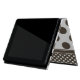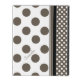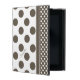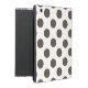 Stylish iPad folio style case with built in stand done in a taupe brown and white polka dot. A smaller taupe and white polka dot pattern decorates the right front edge. Brown script text, on the front, is ready to personalize. Makes a great personalized gift idea.