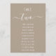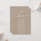 In the upper part, there is the table number written in a handwriting script and the word Table above, in smaller caps (hand letters). Under them, there are the 10 guest names, in similar hand letters. The background is taupe (a light brown), all text is white.