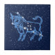 Tile in the zodiac symbol for Taurus in soft silver blue, overlaid with the stars of the constellation, against a starry sky background in deep midnight blue