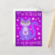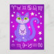 A purple smiling cat with green eyes, curling tail, lucky stars, Taurus horoscope sign logo on kitty's fur, with a gradient magenta purple background and pale pink zodiac signs at top and bottom. Embrace the power of purr-ple!