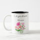 Esta taza es ideal para quienes buscan inspiración cada mañana. Con un fondo blanco brillante, está adornada con un diseño floral delicado que rodea la frase motivadora "Let Your Dreams Blossom" en letras cursivas y elegantes. Las flores están en tonos pastel, como rosa suave y damasco, creando una atmósfera de calma y frescura. La frase invita a empezar el día con energía y positivismo, siendo perfecta para regalar o para añadir un toque especial a tu colección personal.