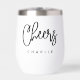 Tasse à vin thermique avec texte de couleur noire ou personnalisée "Tchéers" dans une police d'écriture moderne et votre nom personnalisé en dessous.