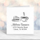 A steaming cup of tea next to a piece of cake on a plate. Customize with your own address.