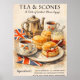 The scene highlights freshly baked scones served with clotted cream and strawberry jam, accompanied by cups of English breakfast tea. Decorative floral teacups, a classic teapot, and subtle Union Jack elements add a touch of authentic British charm. The soft vintage texture and handwritten-style typography give the artwork a nostalgic feel reminiscent of traditional café menus and kitchen prints.