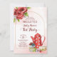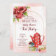 Tea party baby shower invitation template. Red flowers, red polka dot tea pot, tea cup, and a cupcake, watercolor. Lovely for any age.