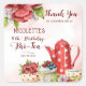 Tea party birthday personalized party stickers template. Red flowers, red polka dot tea pot, tea cup, and a cupcake, watercolor. Lovely for any age.