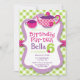 Start steeping the tea and pouring the cream, it's time for a tea party birthday! This invitation features a pink and purple whimsical tea set with a cute green gingham background.