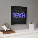 Illuminated urban brick wall with TEACH text in glowing purple neon lights.