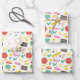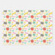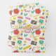 Hand drawn teacher classroom patterned wrapping paper features red apples, apple slices, a book worm, inch worm, rulers, paper clips, yellow stars, gold stars, globe, ruler, chalk board, pink eraser, A+ grades, pencils, and leaves. Would be an adorable way to wrap teacher appreciation or end of year gifts.