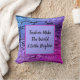 This teacher appreciation throw pillow features an abstract background pattern in neon blue and pink on both the front and the back. Horizontal stripes of vibrant colour are decorated with random black squiggles and lines giving this pillow a vivid abstract look. A solid square in the centre in light blue provides the background for "Teachers Make The World A Little Brighter" which can easily be customized if you desire.