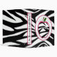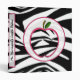 A binder with a zebra print design on the front, back, and spine. Sheer circle with pink trim on front centre. Matching zebra print apple over circle. Pink trim on spine. Add your own text to spine.
